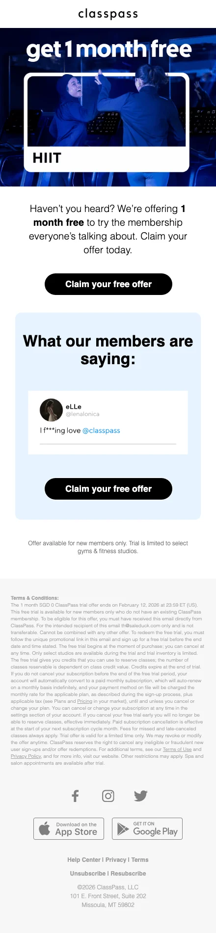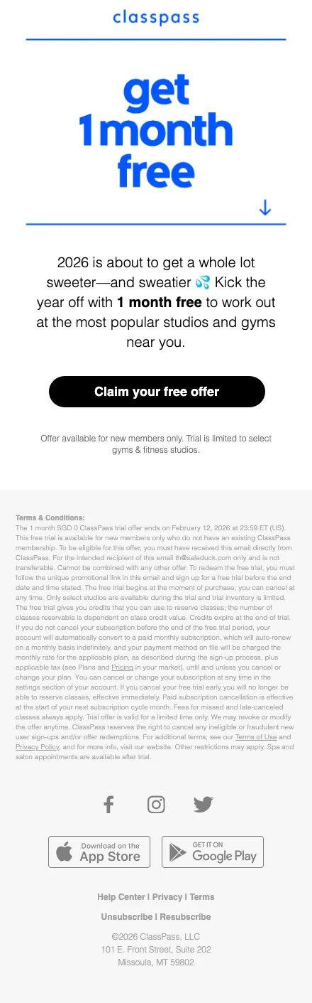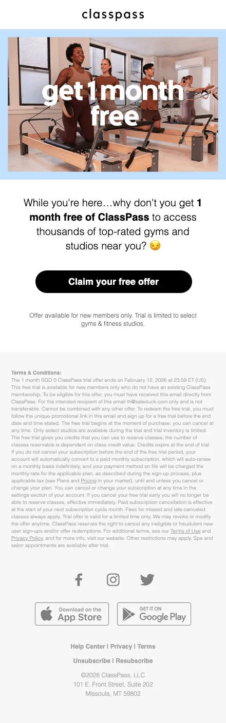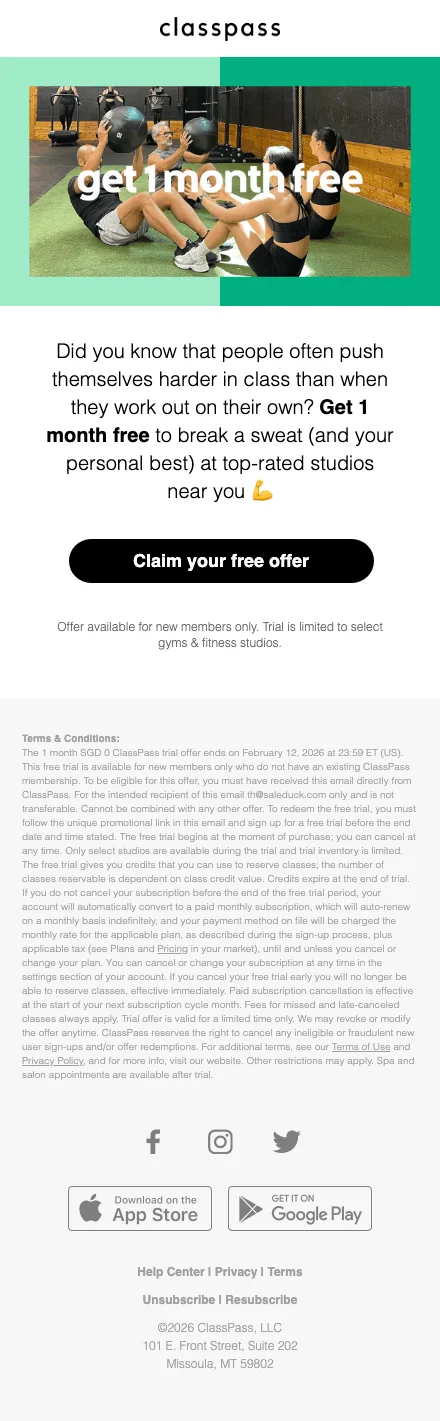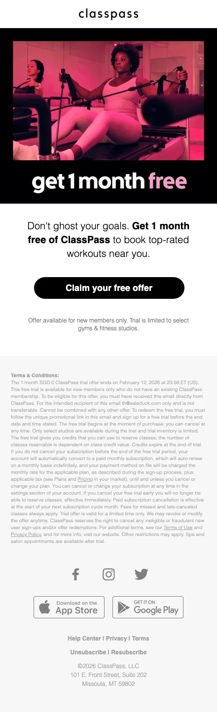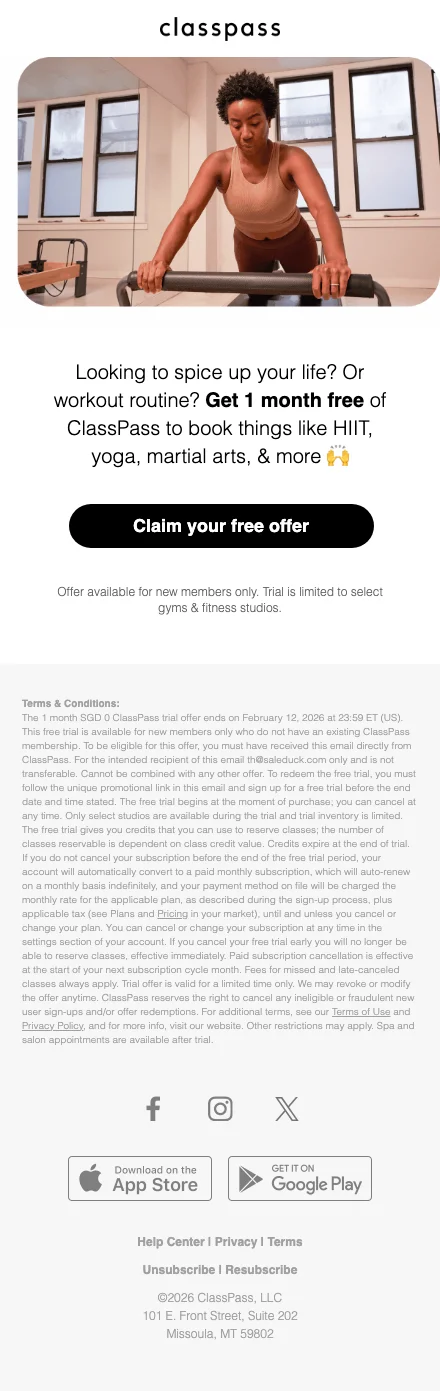 รู้หรือไม่ว่าตอนนี้ ClassPass จัดโปรโมชั่นต้อนรับสมาชิกใหม่ โดยคุณสามารถลงทะเบียนสมัครสมาชิกแล้วรับสิทธิเข้าเล่นกิจกรรมออกกำลังกาย ฟรี! 14 วันเต็มๆ โดยคุณจะได้รับเครดิตในการเข้าคลาสถึง 35 เครดิต (ใช้แลกเพื่อเป็นบัตรผ่านเข้าคลาส โดยแต่ละคลาสมีเครดิตต่างกัน ขึ้นอยู่กับความ premium ของแต่ละสตูดิโอและกิจกรรมนั้นๆ) ซึ่งหมายถึงสามารถเล่นฟรีได้ถึง 4-7 คลาสเลยนะ