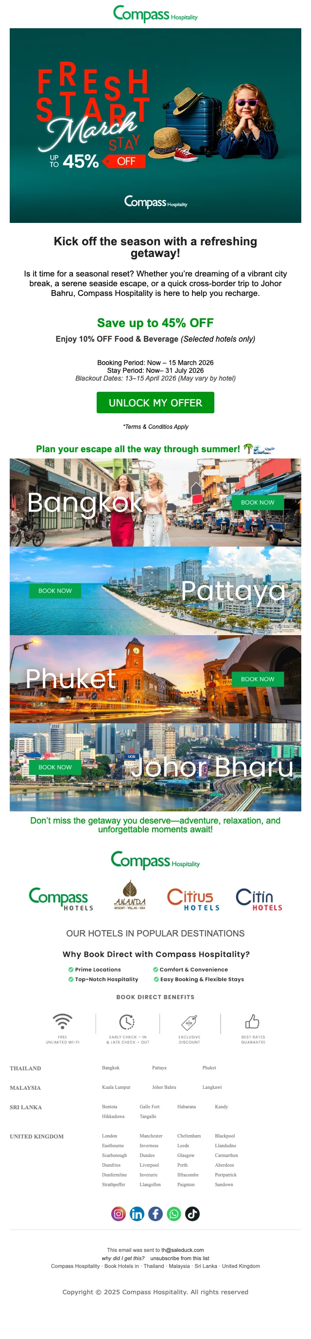 เมื่อคุณทำการสมัครสมาชิก กับ คอมพาส ฮอสพิทอลิตี้ คุณจะได้รับข่าวสารทางอีเมลล์ อัพเดตตลอดเวลา และ รับโปรโมชั่นก่อนใคร ซึ่งลดกว่า 80% พร้อมคูปองโค้ดมากมาย ยิ่งไปกว่านั้น เมื่อจองครั้งแรก รับคูปองส่วนลดทันที 25%